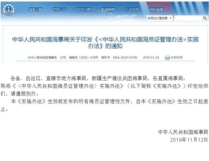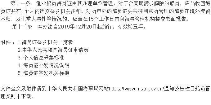 《<中華人民共和國海員證管理辦法>實(shí)施辦法》 2019年12月20日起施行!